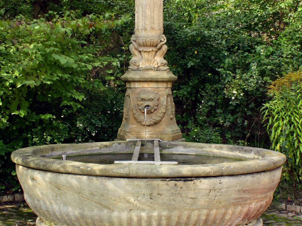 Vor dem Haus der Frau von Stein, benannt nach Charlotte von Stein, welches 1770 auf dem Grund des alten Stiedenvorwerks an der Ackerwand 25–27 von Anton Georg Hauptmann erbaut wurde, befindet sich einer der Brunnen in Weimar, die 1847 von Carl Dornberger geschaffen wurde und von Maria Pawlowna gestiftet wurde. Das Haus der Frau von Stein ist gewissermaßen ein Rest des alten Stiedenvorwerks.Der Standort des Röhrenbrunnens vor dem Haus der Frau von Stein war dort nach 1857 festgelegt worden, während er vorher vor dem Frauenthore aufgestellt wurde. Ihm wiederum hatte der ebenfalls von Carl Dornberger geschaffene Muschelbrunnen am Haus der Frau von Stein Platz gemacht, der nun seinen Platz in der Schwanseestraße gefunden hatte. Der Brunnen ist ein Röhrenbrunnen, der aus einer zylinderförmigen Brunnensäule mit einer bekrönenden Vase. Zum plastischen Schmuck zählen u. a.